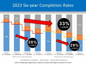 These are 6-year completion rates for students who began their college studies in 2017 from the National Student Clearinghouse Research Center. On the left are completion rates for university students, and on the right are completion rates for community college students. This would have us believe that – first, on average, community college students complete their studies at a rate 33% lower than the completion rate for university students, and second, on average, Hispanic and Black students, in both community colleges and universities, complete their studies at rates 29% and 28% lower, respectively, than the completion rates for Asian and White students.