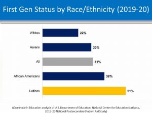 According to a webinar on “Fast Facts of Latinos in Higher Education” (April 2024), jointly presented by Excelencia in Education and the American Association of Hispanics in Higher Education, in the 2019-2020 academic year, 31% of students were first-generation, with Latinos, at 51%, being more likely to be first-generation than any other racial group, and African Americans having the next highest percentage. This is very important data and a root cause! This illustrates the scope of the challenge.