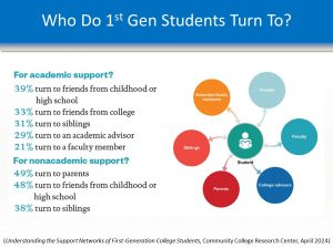 According to a webinar on “Who Do First-Generation College Students Turn to for Support?” (April 2024), presented by the Community College Research Center, when it comes to academic support, here are the top five groups that first-generation students turn to, with faculty members, at 21%, being last on this list. Why is this when we know, based on research, that interaction with faculty is an important factor for student success? Faculty members should be first on this list. The fact is that this research and other surveys of student engagement reflect the experiences of students who are in the dark!