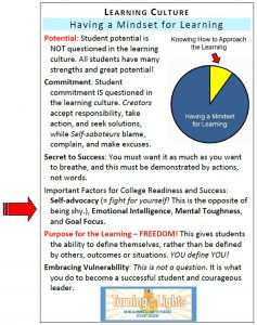 And here is what it means to have a mindset for learning in the learning culture. This is the biggest and most important part of the learning culture. Give me a student with a strong mindset for learning, and I’m going to show you a successful student! The important factors highlighted above include self-advocacy, which means students must fight for themselves, and this is the opposite of being shy! Also emotional intelligence, mental toughness and goal focus are necessary for college readiness and success. In fact, emotional intelligence is not only important for academics; it is important for leadership. The learning culture is educational wealth, if this language of success and strategies for effectively approaching the learning are not present in our students’ environment, then how are they expected to succeed?