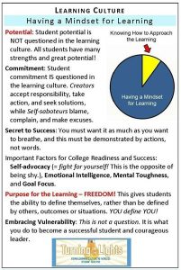 Learning culture – a culture for learning exists in every institution of higher education, including having a mindset for learning (Figure 1), and knowing how to approach the learning (Figure 2), with having a mindset for learning being the larger and more important part. Students are expected to know and apply the learning culture to succeed; however, it is also the hidden curriculum, which means that the majority of students, especially first-generation college students, are not aware of it when they begin their college studies.