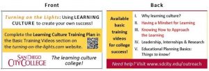At the UCSD bookstore, I needed help to find their selection of polo shirts. This is when I met Ariana, a bookstore team member, first-generation Latina from Riverside (CA), and third year UCSD student majoring in psychology. I had no doubt that she was in the dark with regards to the learning culture. After Ariana helped me to select a polo shirt, I took the opportunity to transform her life. I first asked if anyone at UCSD had said the words “learning culture” to her. She answered, “No,” (this was not a surprise!) and I replied, “Well, then this is your lucky day, because I am about to transform your life!” I then gave her a learning culture card and proceeded to explain the two parts of the learning culture and the learning culture resources referenced on the card, including the learning culture training plan for students, with basic training videos. With a big smile, and the look of hope in her eyes, Ariana simply said, “Thank you!” I walked away with my UCSD polo shirt and the wonderful feeling of knowing that yet another student, with great potential, had been empowered to create her own success, and this encounter was extra special given that it took place during Thanksgiving week!