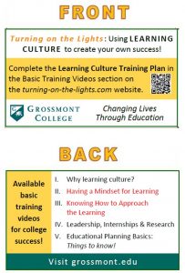 How is this possible? At this very crucial moment when he is beginning his college studies with goals and dreams, he is left to succeed/be traumatized through trial and error in the dark in an accelerated summer class. How effective will the school’s support services be in this case, and truthfully how long will it take for him to fall behind on his way to failing the class? How common is this scenario each term across higher education, especially for first-generation college students? Yet, how would this be different if he had been introduced to the learning culture with a simple “learning culture card” (sample shown below) when he first applied to the college?